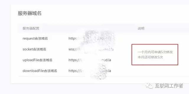 微信官方规定小程序的允许请求的地址都是https开头,所以如果你想搞微信小程序开发,那么服务的地址都必须以https协议的方式提供,也就是说http是不能用的。而且每个月仅能做出5次修改,所以且行且珍惜吧!