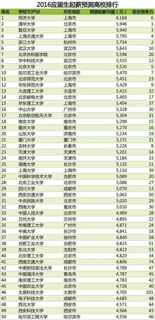据统计,2016年应届毕业生数量达到了破纪录的749万,又是一个“史上最难就业年”。那么童鞋们最关心的恐怕自己学校和专业的就业及就业薪资情况吧? 下面百态君就跟大家分享几组某大数据网同时挖掘了国内各大高校毕业生过去五年起薪数据,并根据宏观经济趋势与行业薪酬增长率建立模型,预测2016年各大高校应届毕业生起薪数、地区竞争力、行业就业情况及专业就业情况……
