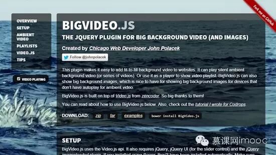 这个插件会将视频或者图片转换为网页大背景,他的演示页面利用视差滚动机制展现了一个全屏视频。